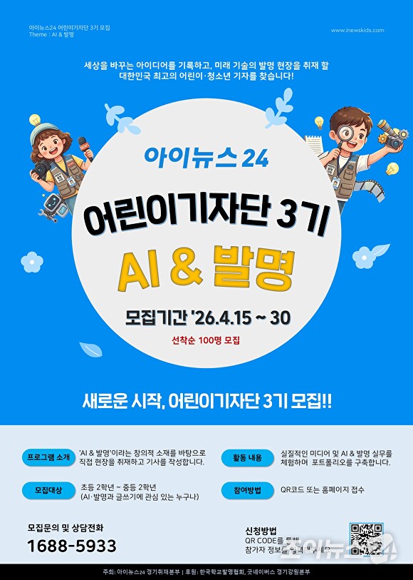 [조이뉴스24 양찬희 기자] 아이뉴스24 경기취재본부는 과학영재 선발 기준이 창의성과 실전 경험 중심으로 변화하는 흐름에 맞춰 ‘아이뉴스24 어린이기자단 3기’를 운영한다고 2일 밝혔다.
